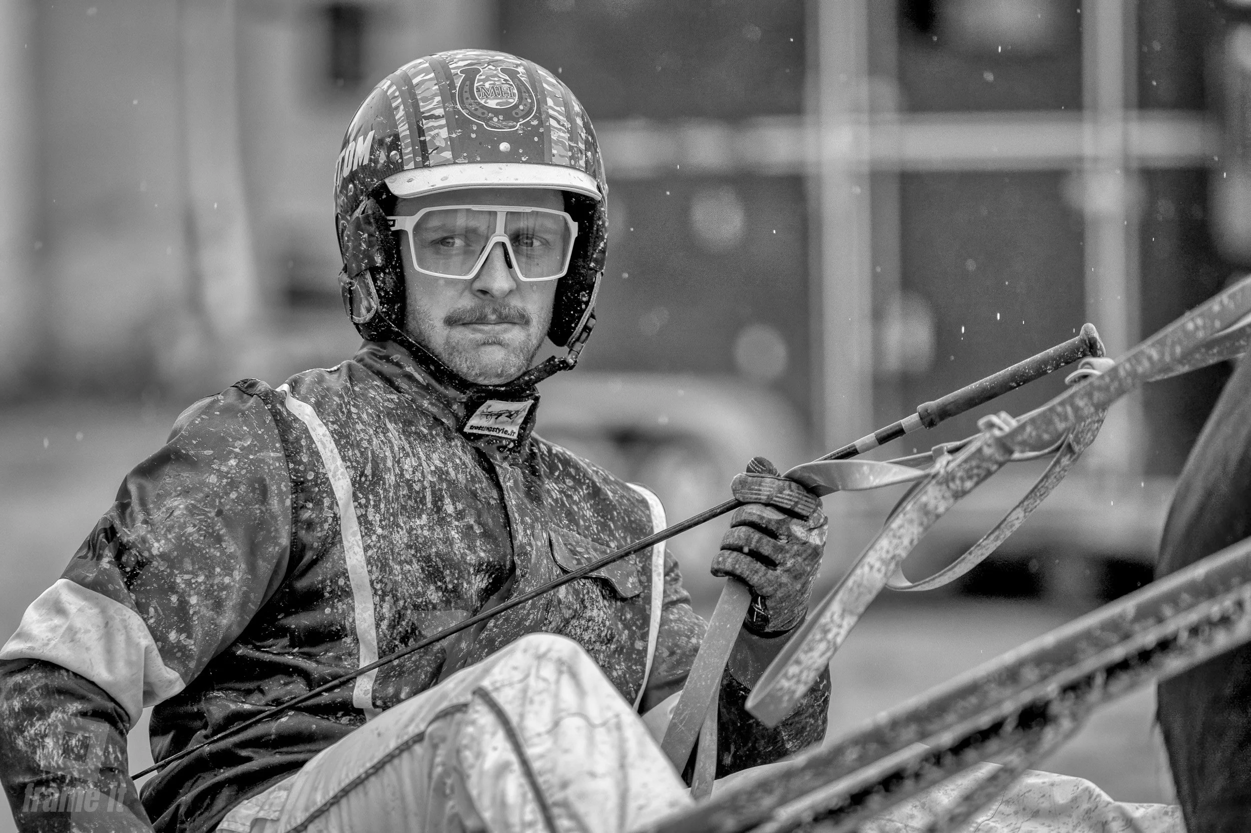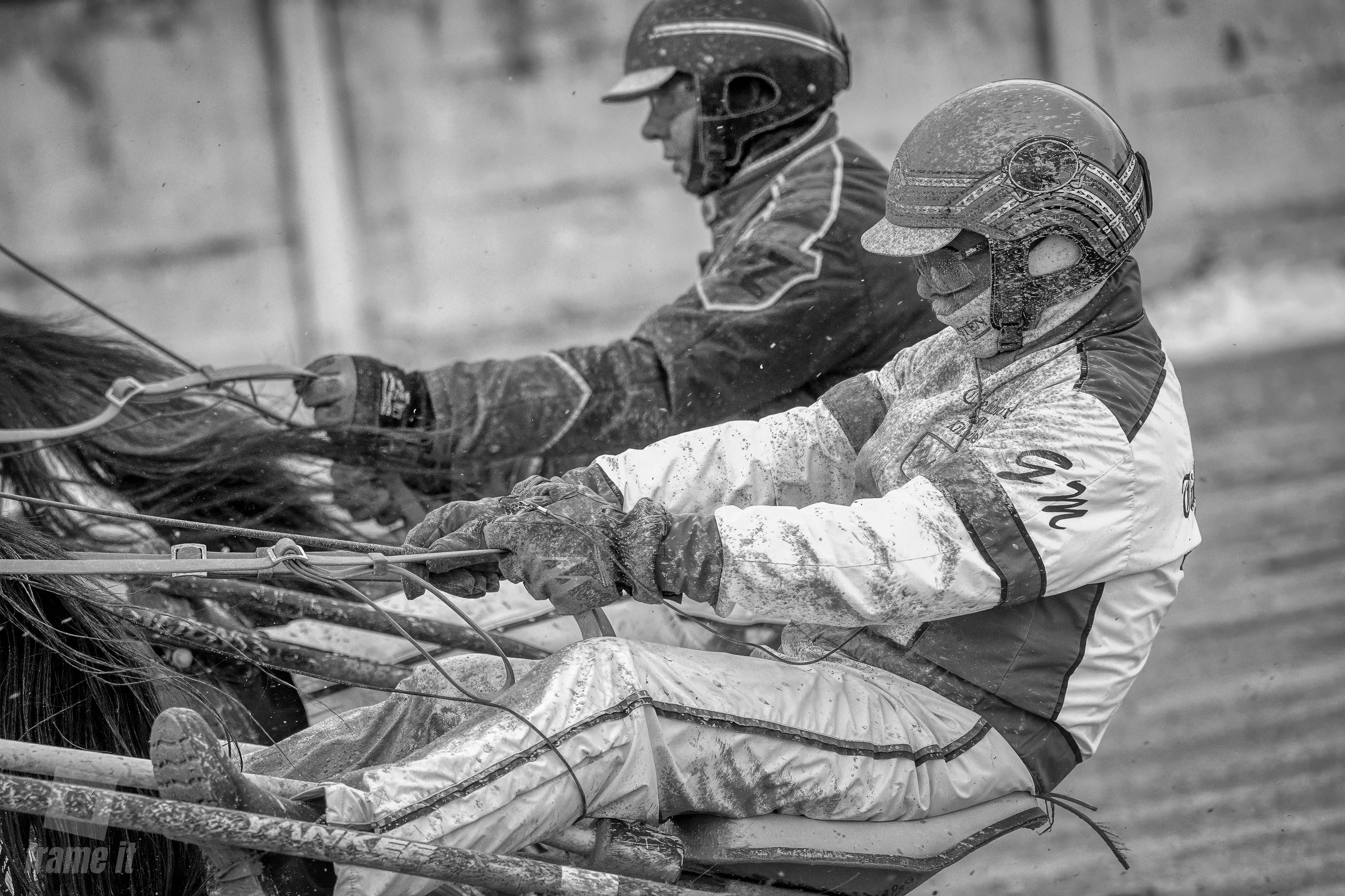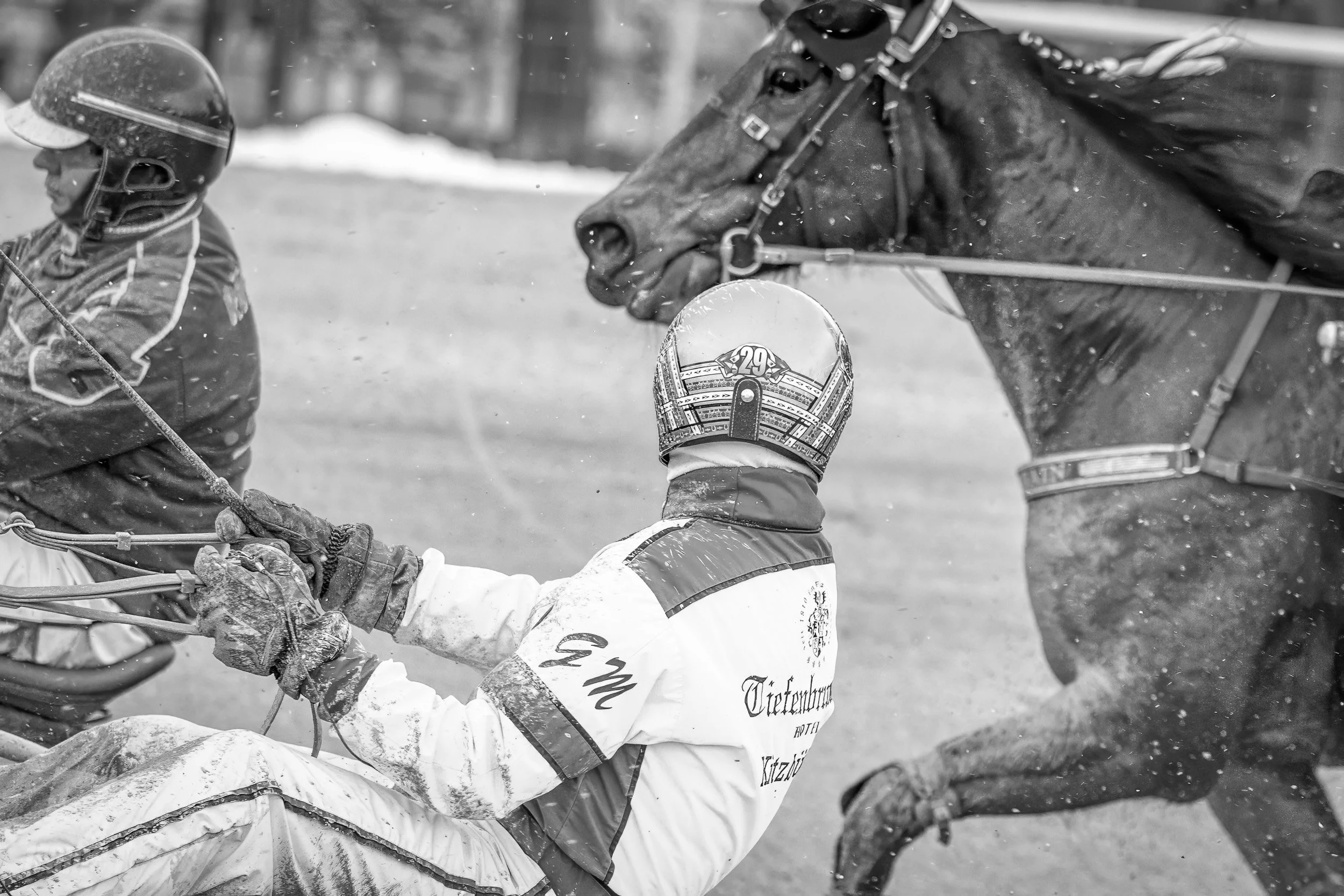 Hier wird jeder Meter beobachtet, jede Bewegung analysiert, damit auf der Bahn alles fair und sicher abläuft. Und die äusseren Bedingungen, wie spritzendes Wasser, gespannte Muskeln, fokussierte Gesichter und Pferde, die mit voller Kraft traben, verleihen den Bildern Charakter.