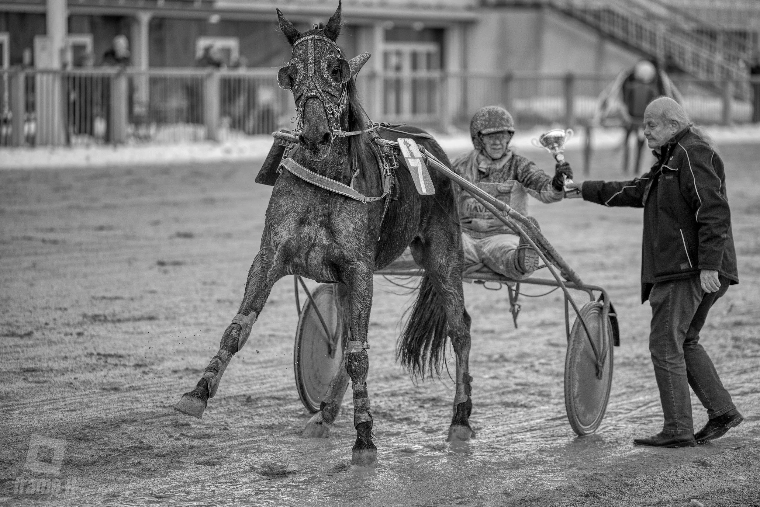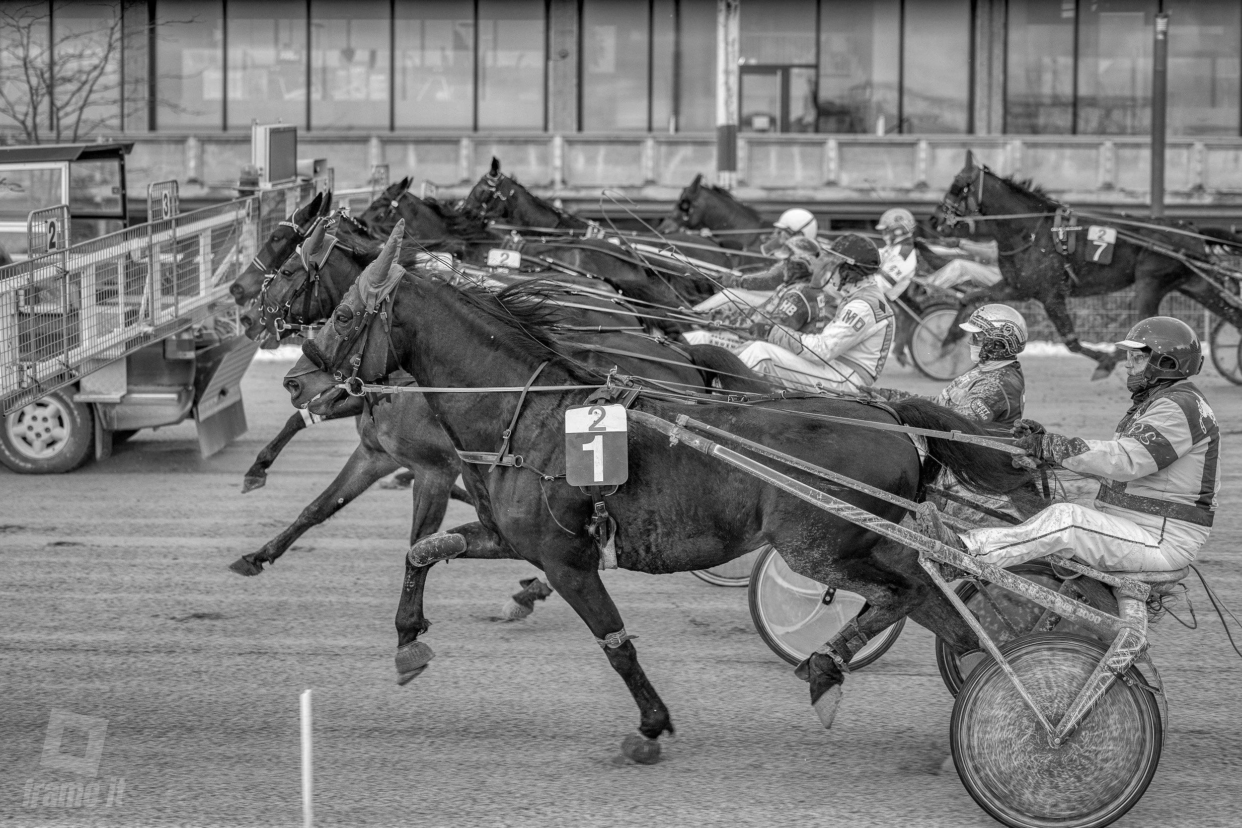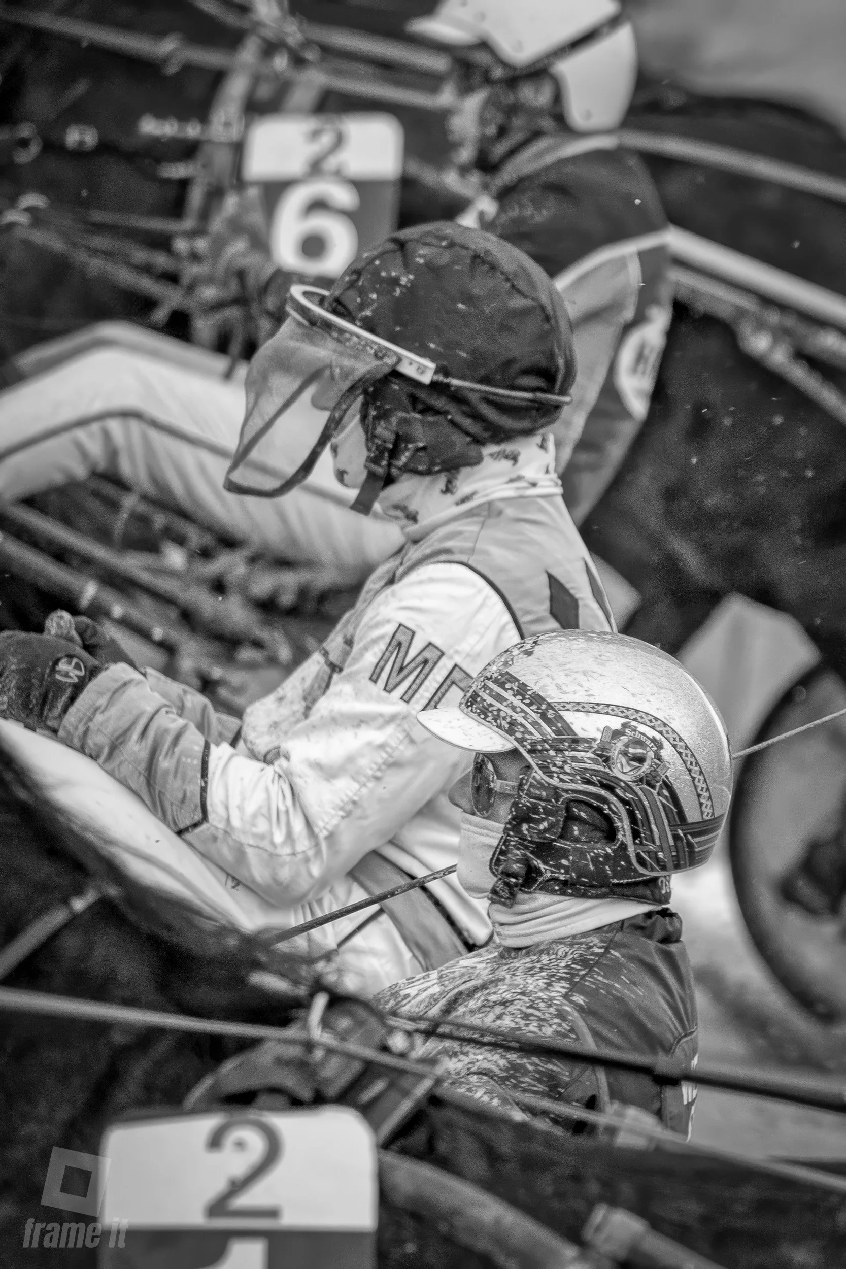 Hier wird jeder Meter beobachtet, jede Bewegung analysiert, damit auf der Bahn alles fair und sicher abläuft. Und die äusseren Bedingungen, wie spritzendes Wasser, gespannte Muskeln, fokussierte Gesichter und Pferde, die mit voller Kraft traben, verleihen den Bildern Charakter.